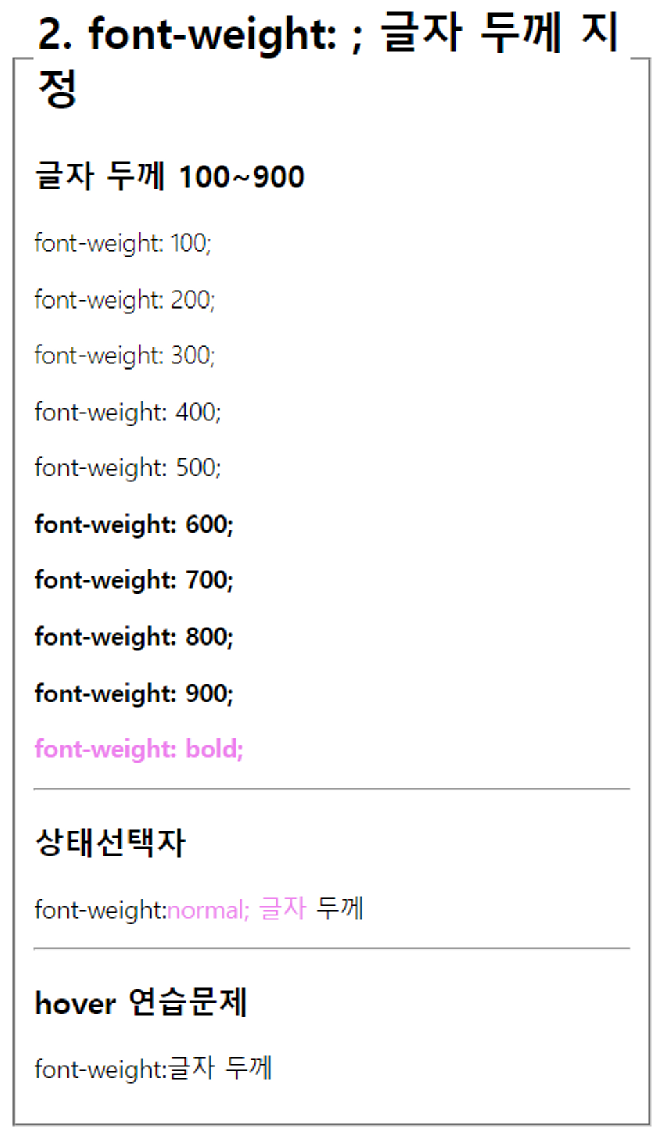 <legend class="h2">2. font-weight: ; 글자 두께 지정</legend>