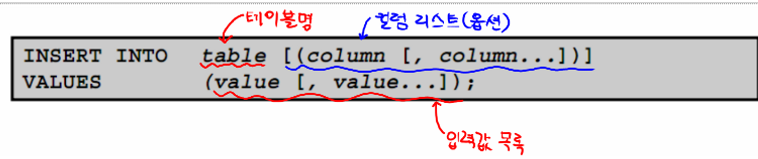 • 새로운 데이터를 테이블에 입력할 때 사용하는 문법