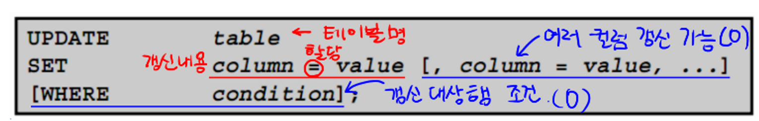 - WHERE절 : 갱신 작업의 대상이 될 행을 선택하는 조건식을 작성한다. where절은 생략가능하나, 생략하는 경우 테이블의 모든 행이 갱신의 대상이 된다.