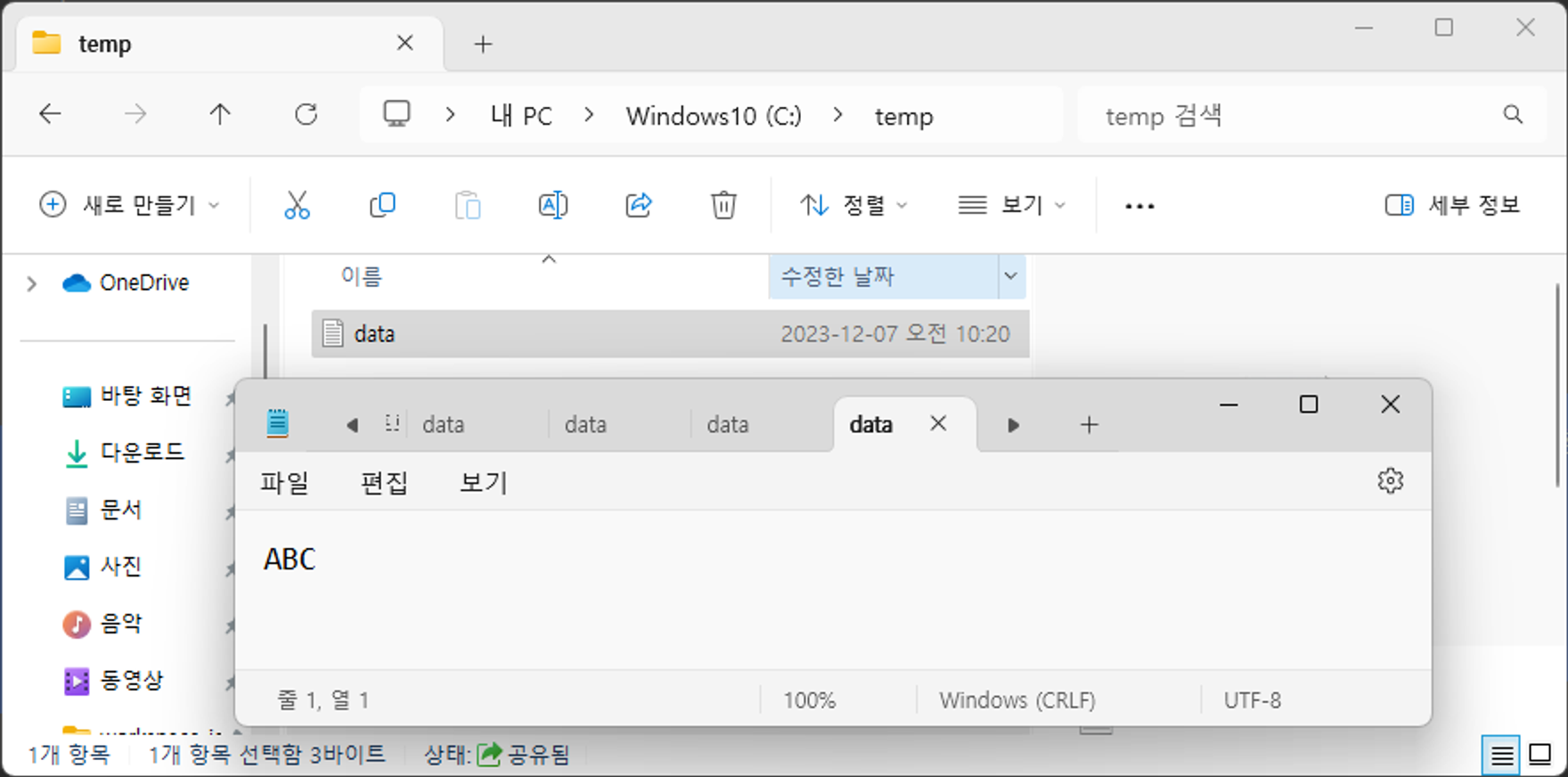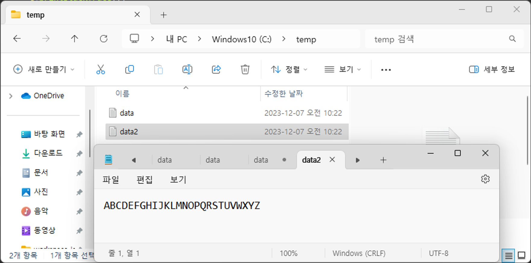 C:\temp에 data.txt.라는 파일이 생기고