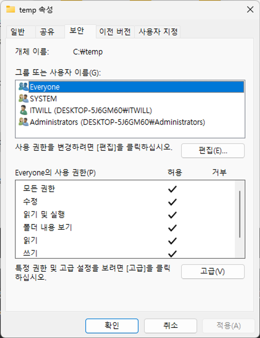 2. 속성→ 편집 → 보안탭