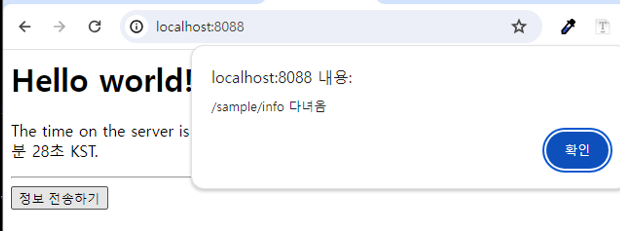 <%@ taglib uri="<http://java.sun.com/jsp/jstl/core>" prefix="c" %> <%@ page session="false" pageEncoding="UTF-8"%> $(document).ready(function(){ //버튼 클릭시 $("#btnSend").click(function(){ // 리소스를 생성해서 전달(비동기방식) var member = { /* "userid":$("요소").val(), */ "userid":"admin", "userpw":"1234", "username":"관리자", "useremail":"admin@admin.com" }; $.ajax({ url : "/sample/info", type : "POST", contentType : "application/json", data : JSON.stringify(member), //json타입문자열로 전송 success:function(data){ alert('/sample/info 다녀옴!'); $('body').append(data); }, error:function(){ alert(" 실패! "); } });//ajax });//click });//ready
