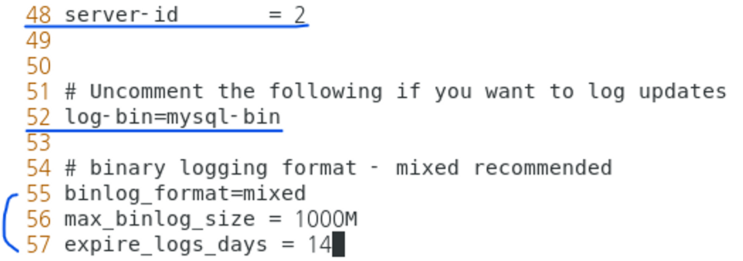 48번 : server-id = 1 -> server-id = 2 로 변경(Slave db이름을 인식시킴)