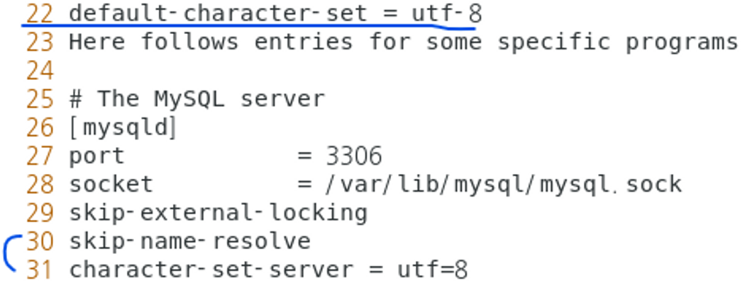 :22 -> 22번 빈라인 : default-character-set = utf-8